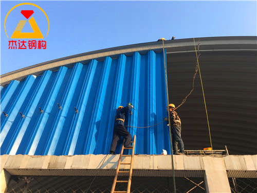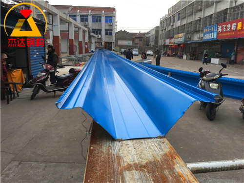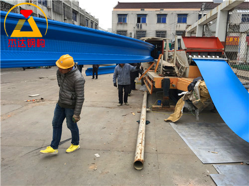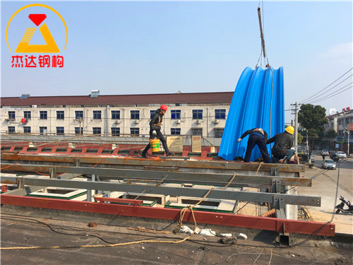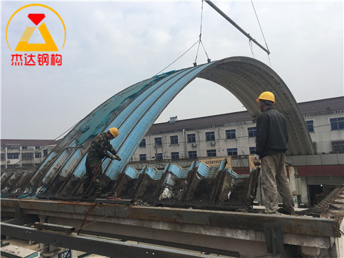 安裝階段:拱形屋頂瓦由杰達(dá)無(wú)梁拱設(shè)備現(xiàn)場(chǎng)壓型成型,逐榀吊裝拼接,完成后再依次安裝山墻瓦及過(guò)道屋面板。