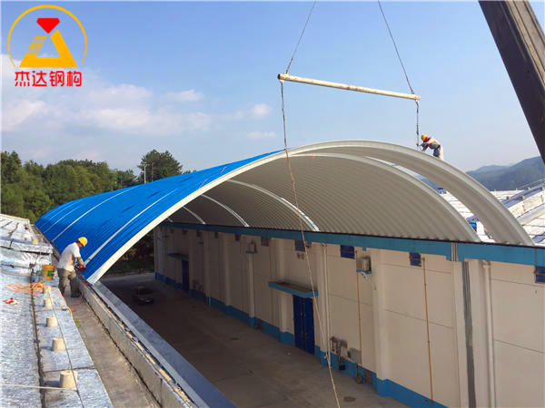 在拱腳和拱形屋頂中央兩側安裝角鋼支撐,保障結構穩定。