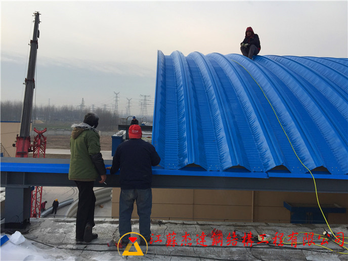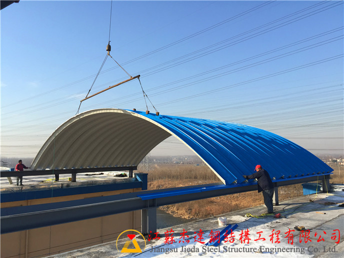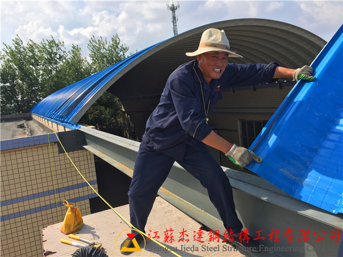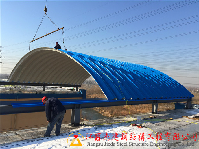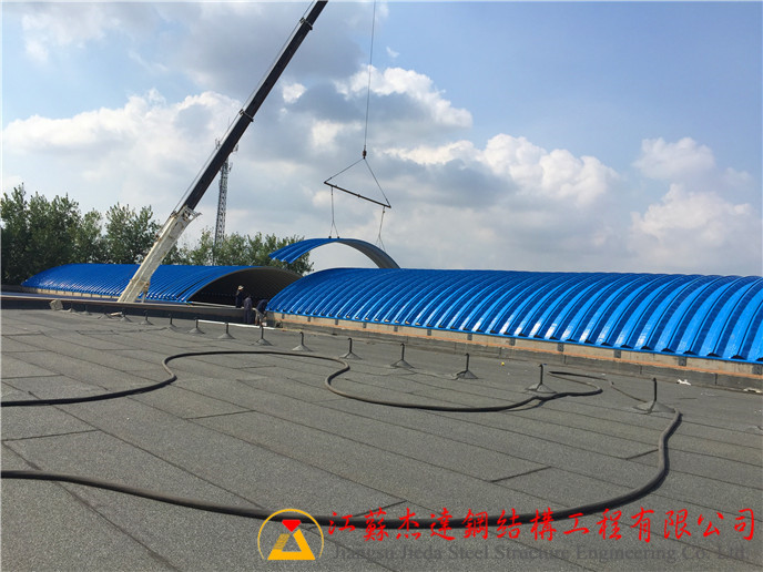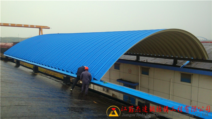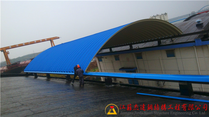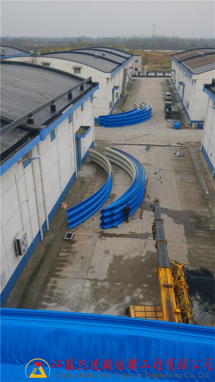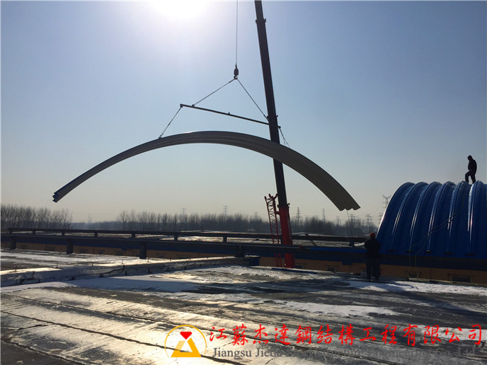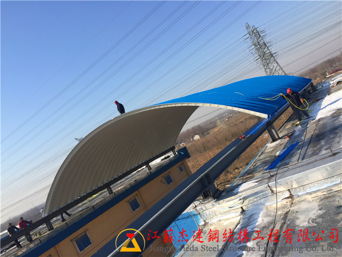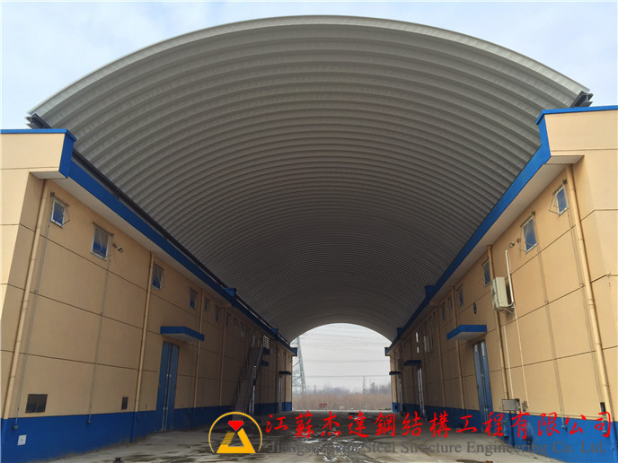 江蘇杰達鋼結(jié)構(gòu)工程有限公司承建的過道式拱形屋頂,主要用于堆放物料和設(shè)備。該結(jié)構(gòu)設(shè)計能夠在陰雨天氣下為糧食儲備庫提供良好的保護環(huán)境,確保設(shè)備和物資的安全存放與使用。