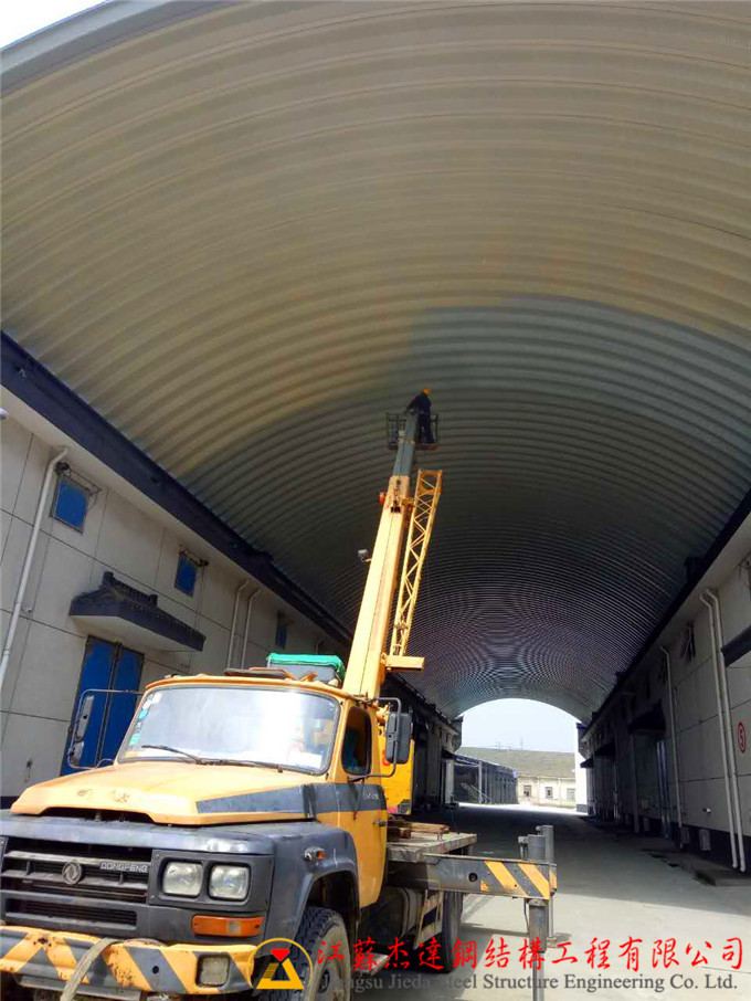 本工程為江蘇揚(yáng)州市邗江區(qū)公道糧庫(kù)拱形屋頂倉(cāng)間罩棚制作安裝,施工周期短,質(zhì)量可靠,滿足倉(cāng)儲(chǔ)功能需求。