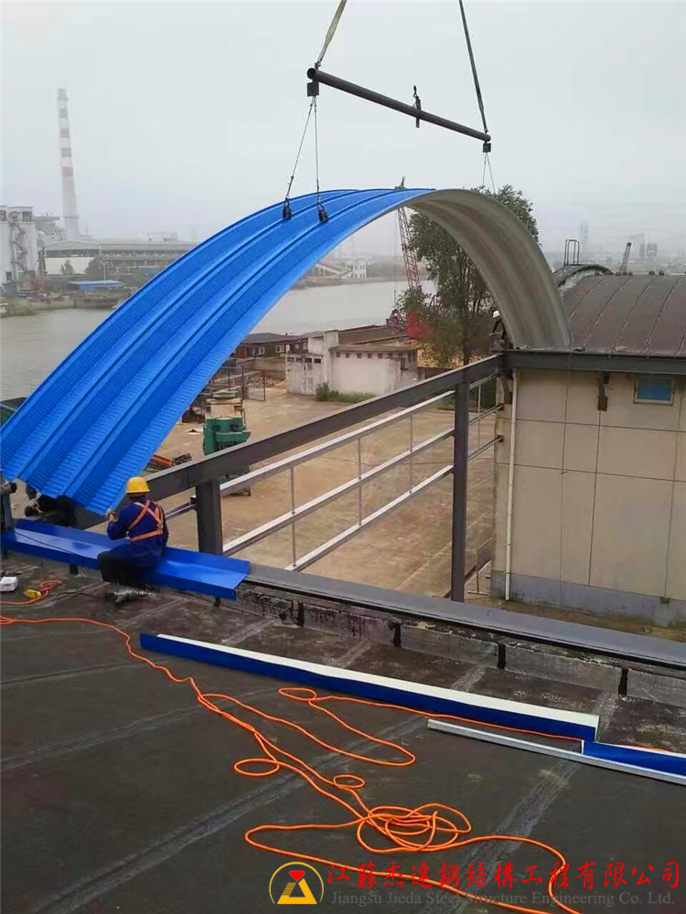 2024年,江蘇杰達鋼結構工程有限公司成功承接并完成青島某化工企業倉庫屋頂的拱形屋蓋更換工程,施工質量與效率獲得業主一致認可。工程名稱:青島紅星化工廠倉庫屋頂更...