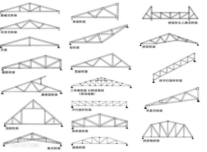 從力學方面分析,桁架外形與簡支梁的彎矩圖相似時,上下弦桿的軸力分布均勻,腹桿軸力小,用料很省;從材料與制造方面分析,木桁架做成三角形,鋼桁架采用梯形或平行弦形,鋼筋混凝土與預應力混凝土桁架為多邊形或梯形為宜。