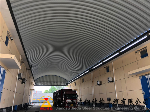 該項目位于江蘇省南京市浦口區糧食儲備庫內,罩棚跨度達16米,長度60米,采用拱形波紋鋼屋蓋結構。結構兩側設有250*250H型鋼,上方焊接托板,配合兩側桁架支撐。桁架外側覆蓋了通過壓制成型的拱形瓦片,用作山墻,增強整體穩定性與美觀度。