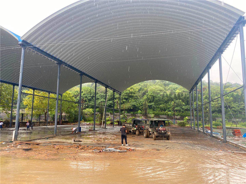 拱形屋頂采用兩連跨設計,跨度達18米,高度約3.6米。盡管施工現場積水較深,但屋頂安裝完成后,施工人員依然能夠在屋頂下正常作業,體現了設計的合理性與施工的專業性。