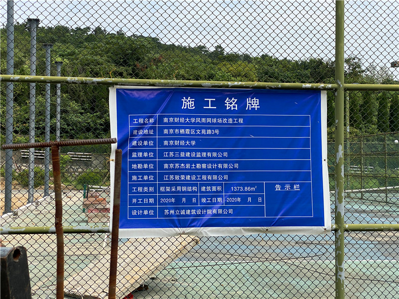 施工銘牌顯示,本次工程位于南京棲霞區的風雨網球場改造項目,施工單位為江蘇杰達鋼結構工程有限公司,確保施工質量符合相關規范。